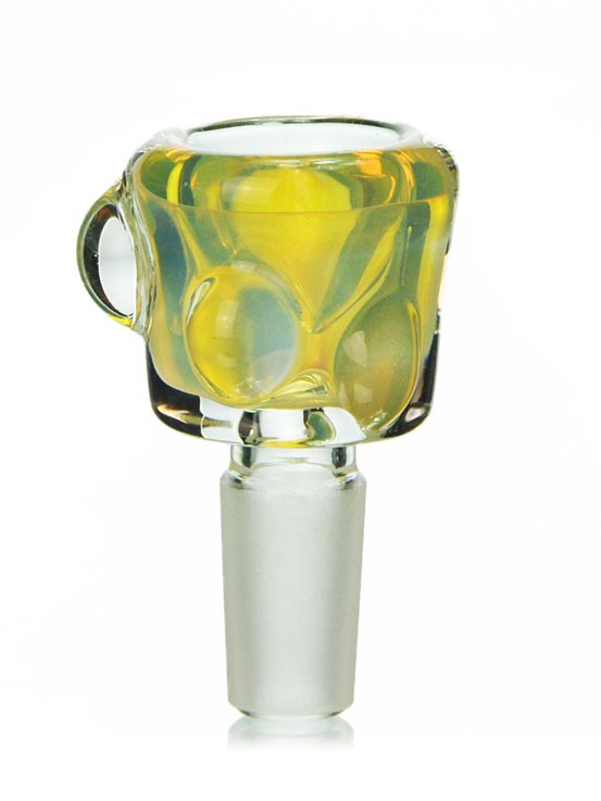 The 18mm Leach Bowl Piece is a thick bowl that is beautifully crafted with inside out colors. It's a nice light yellow tint throughout the whole bowl, allowing you to still see the smoke get filled up within. The bowl has glass nodes along the sides for easy handling.