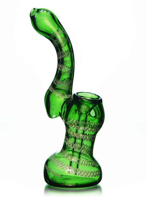 This glass bubbler features a sherlock style in an elegant emerald green colored glass. Slyme accents in the body and mouth really add to the appea...