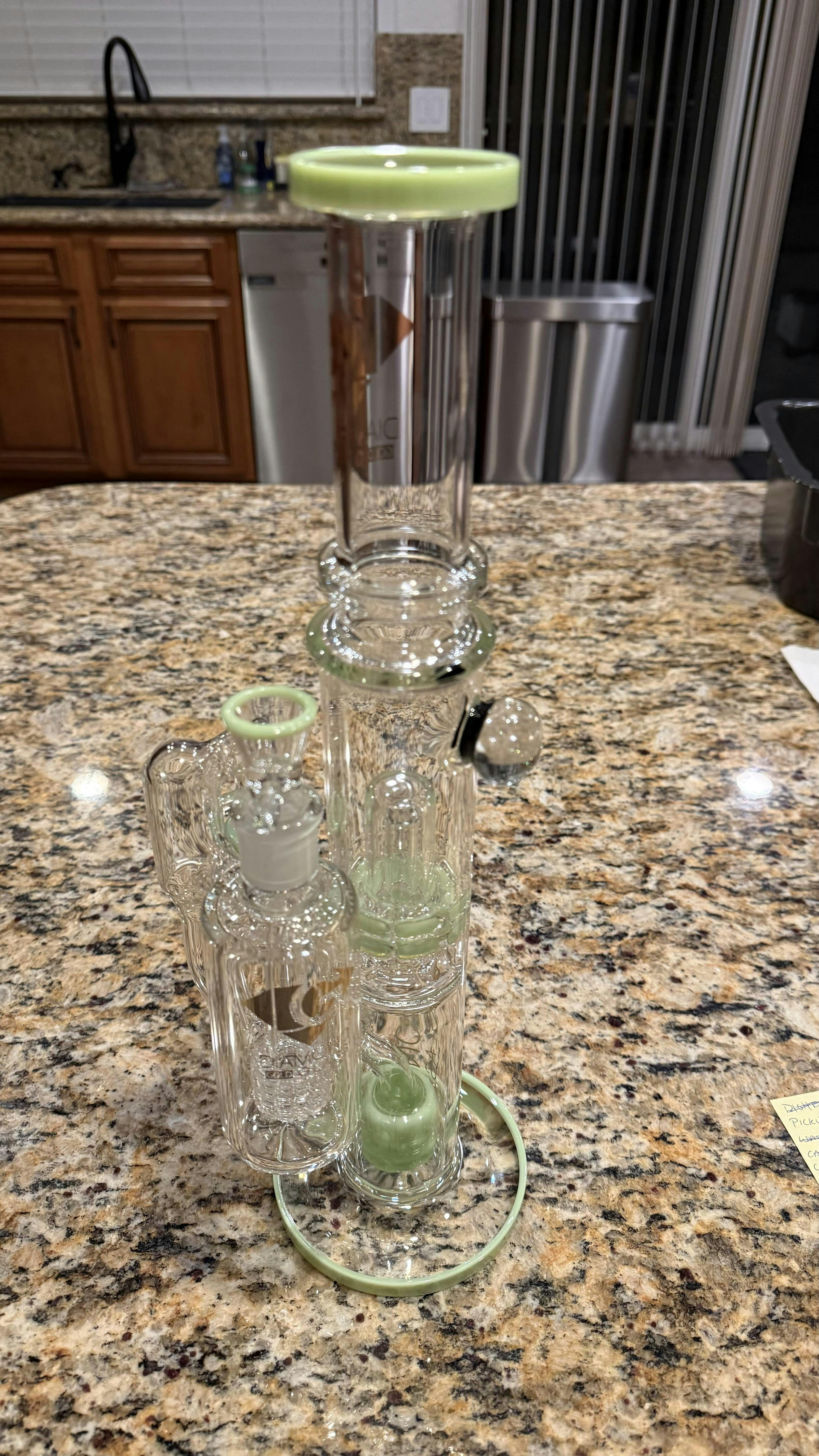 Don't be intimidated by its unique percolator. This piece is perfect for beginners and vets alike. It's also quite durable, made from 5mm borosilicate glass. It's anchored with a thick, wide base as well. The Moonrock is a great example of how you don't have to spend a fortune to get the best glass. At 15”, this is a full-sized piece with advanced percolation, priced for any budget. It even comes complete with a matching dry flower bowl to get you started right away.