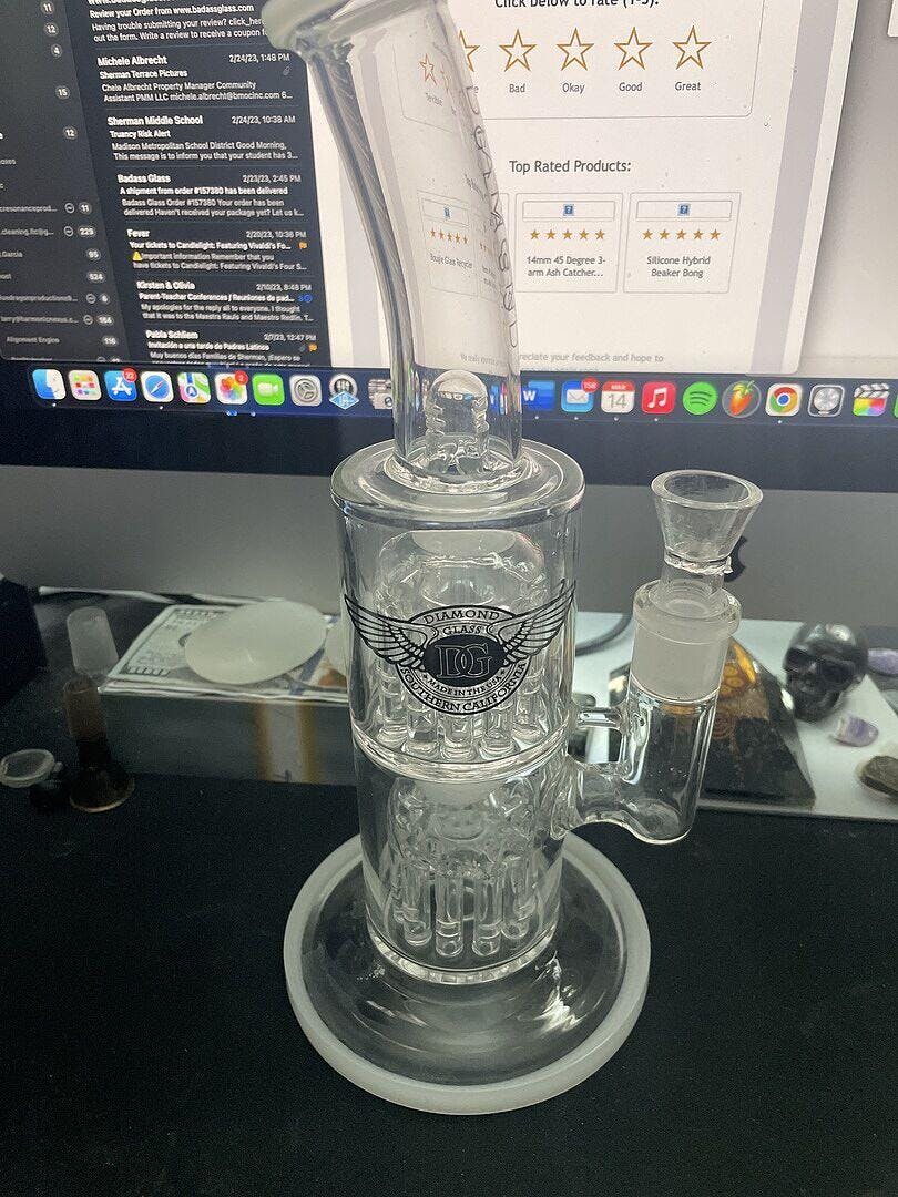As usual, Diamond Glass delivers another perfectly symmetrical and thick glass bong with a super thick joint. The extra wide body and thick base really makes this bong sit firmly anywhere you place it. The curved mouthpiece narrows to a perfect width, and is finished with a nice slime color outline.