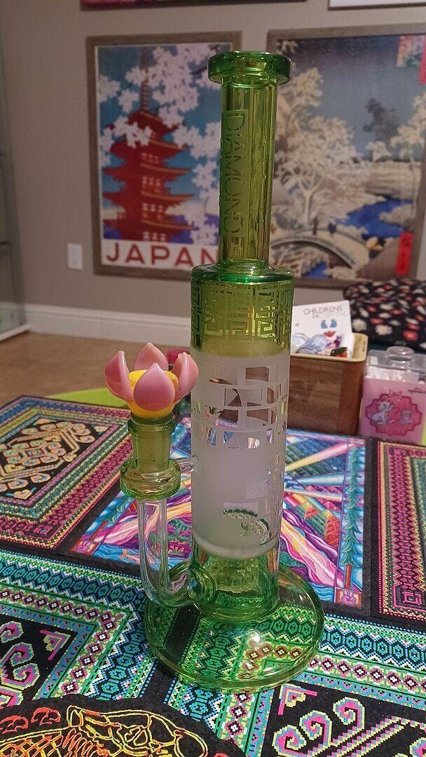 This elegant water pipe by diamond features effortless diffusion and a quick clearing tube. Starting with the green and amber color tubing, this thing is packed with a laser cut showerhead that leads directly to a honeycomb. The showerhead perc will elevate the water through the honeycomb for a quick double layer of filtration.