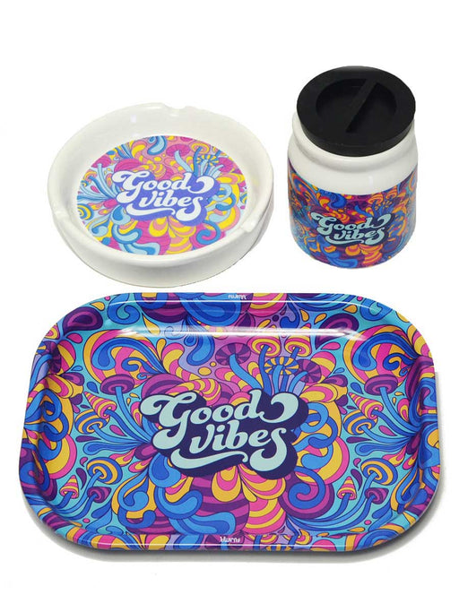 Treat yourself or a loved one to something special with the Good Vibes Gift Set! This unique set includes a rolling tray, a stash jar, and an ash t...