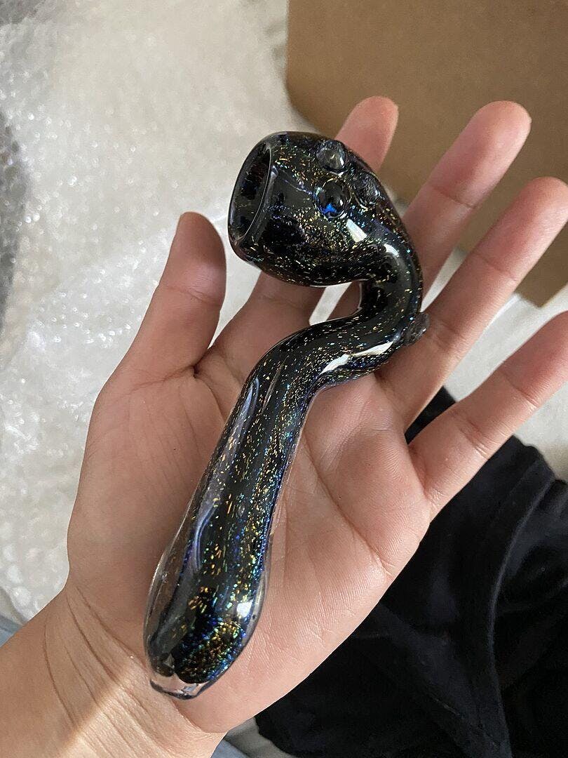 Get as high as the stars with this Cosmic Lights bowl by Glob Squad Glass. The cosmos will come to life with each deep bowl you pack, mesmerizing you with the blue and black color. A bright streak of shooting stars is visible all around the pipe. It’s 5” in length with a convenient carb and easy grip. Shoot for the moon, and you’re sure to land with the stars! All orders arrive in discreet packaging. Never worry again!