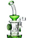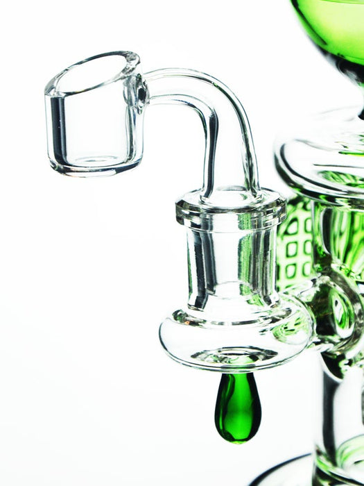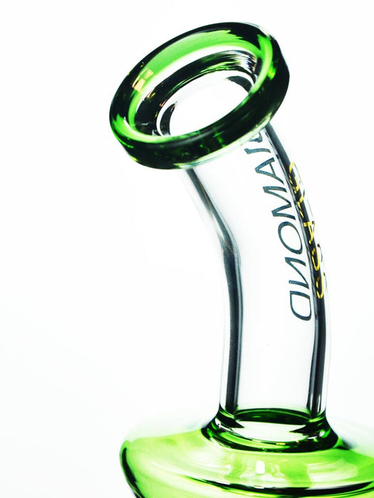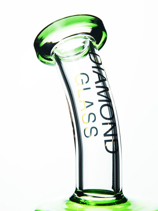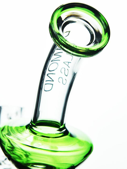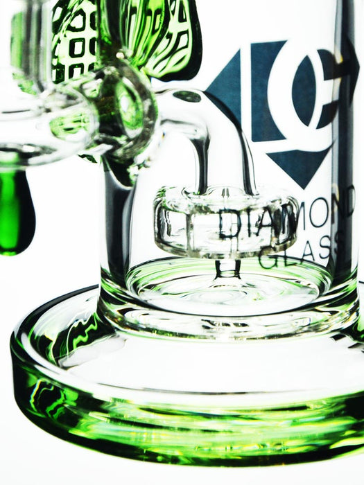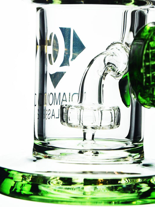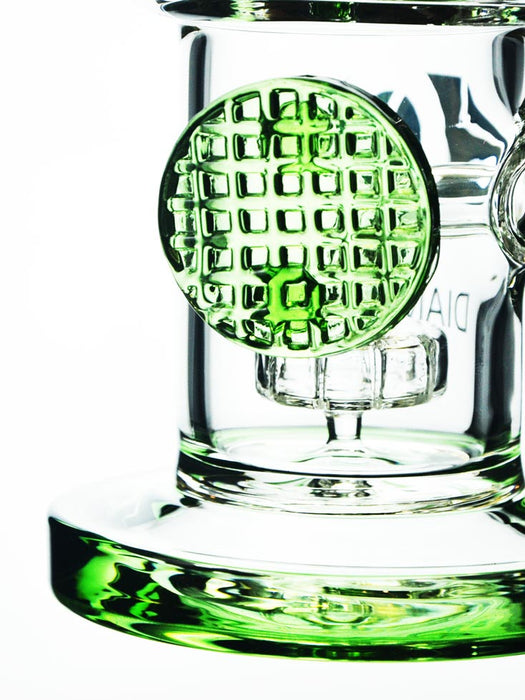 This simple-looking rig is deceptively complex. Its wide design is accented in emerald green with a perfectly made waffle pendant that is attached firmly to the side. Starting with the oversized showerhead percolator, this rig is perfect for daily dependable use that is easy to use and maintain.