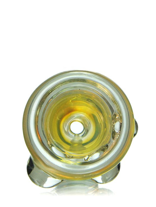 The 18mm Leach Bowl Piece is a thick bowl that is beautifully crafted with inside out colors. It's a nice light yellow tint throughout the whole bowl, allowing you to still see the smoke get filled up within. The bowl has glass nodes along the sides for easy handling.