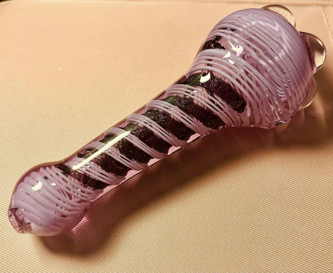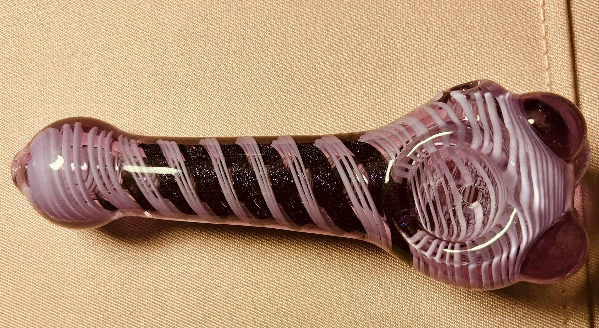 The DNA Dychro Pipe features vibrant purple glass swirled inside and out with black dychro. The pipe shimmers in the light and is made of thick glass accommodating a deep bowl for huge hits. A large glass bead sits on the right side of this pipe to help get a more secure grip. This one will never slip through your fingers.