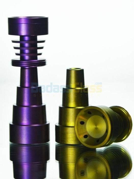 The 6-Hole Domeless by Dab Logic now comes in a variety of different anodized colors. The 6-hole design is great because it has a nice plate indented in the middle with six smaller holes around the edges. The top plate is removable for easy cleaning.