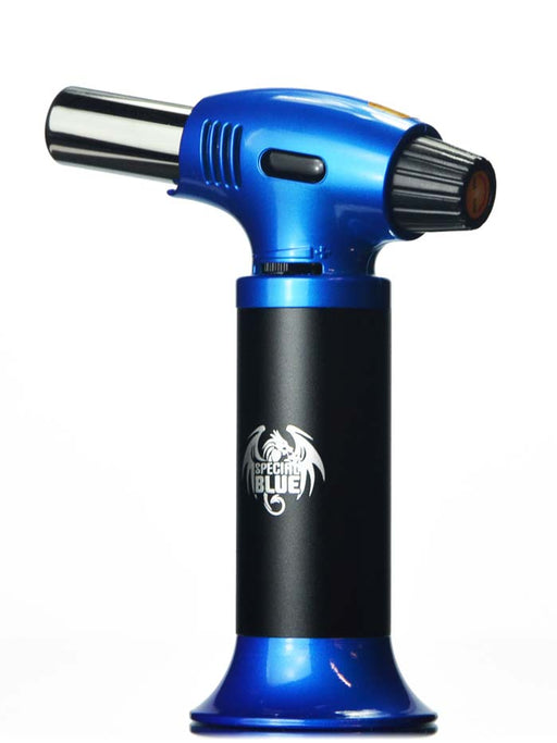 This butane torch by Special Blue stands at 6.25 inches tall on its built in base and comes in a glossy royal blue color with black grip. This lightweight, refillable butane torch works at any angle and features auto ignition. Refills quickly and has an adjustable flame, this torch will keep you dabbed all day.