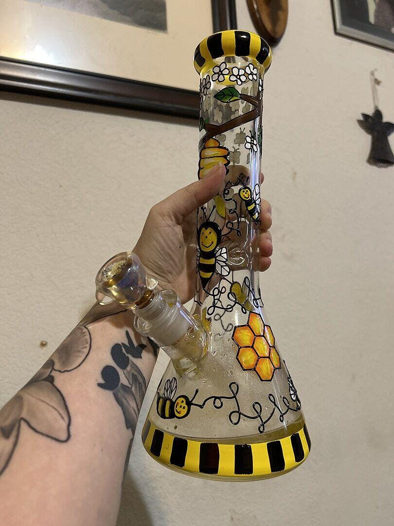 The Busy Bee Bong stands at a foot tall and features a whimsical hand painted display of buzzing bees. Not only is this piece fun to look at, but it has a 2 inch wide tube that flares out to the 5 inch base for a large beaker chamber. This yellow bong delivers large hits that sting like a bee, but no worries —it includes an ice catcher to cool the smoke before it reaches your lungs.