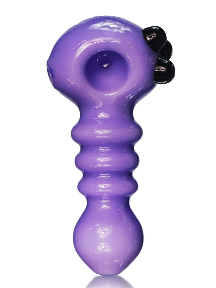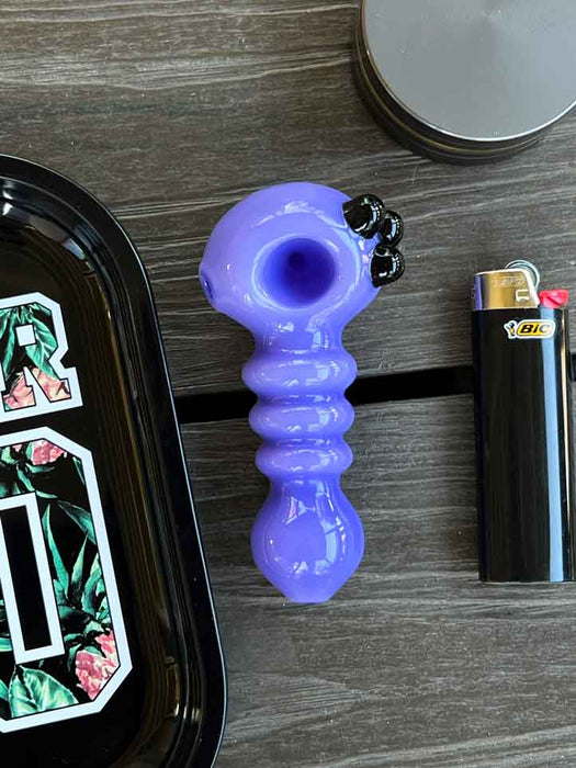The cosmic purple pipe by AFM Glass is the perfect daily driver glass pipe. The pipe has 3 rings in the middle of the spoon as well as 3 black knobs on the right side. As always AFM glass pipes alway have the perfect sized holes for the best experience.