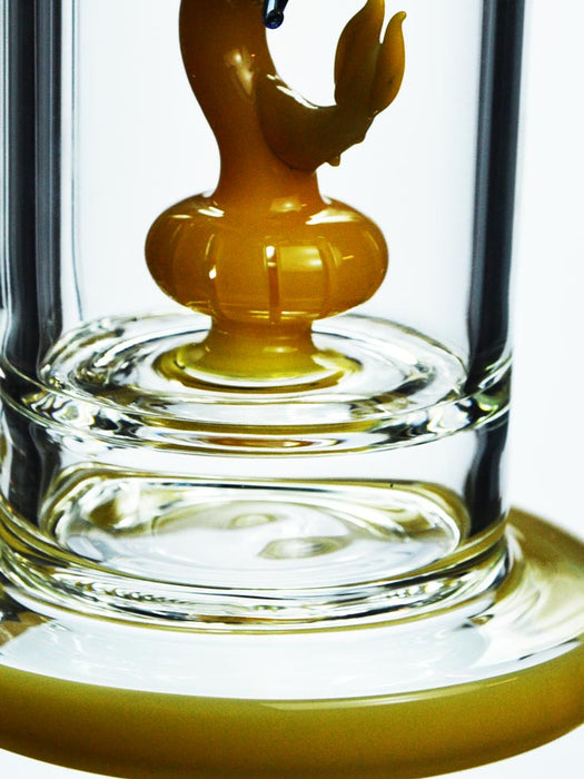 This straight shooter bong is built with thick, sturdy glass that helps protect the bong from the outside world. The orange trimmings only complement the beautifully crafted "Dragon Perc" that controls and filters the smoke. The wide bowl piece allows you to pack in a good amount fo herb and the flitted mouthpiece allows you to comfortably rip and enjoy the high.