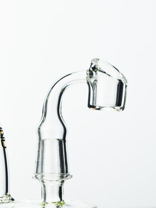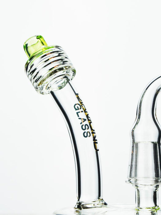 The 5mm borosilicate glass base will keep this rig well-balanced while the 4mm tubing ensures even the most vulnerable parts of this piece will stand the test of time. At 7” tall, the mouthpiece has been specially designed to be a safe distance from the nail. Despite its height, this rig's compact puck design makes it a perfect travel companion. Complete with a matching Diamond Glass dome, white accents give this piece an understated style alongside dependable functionality.