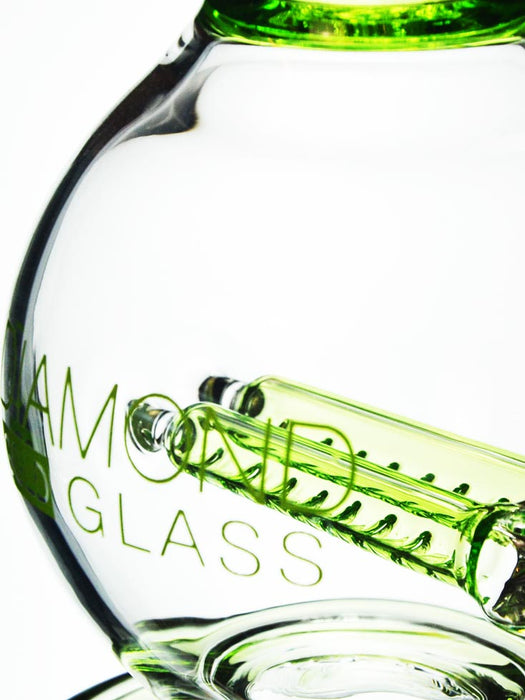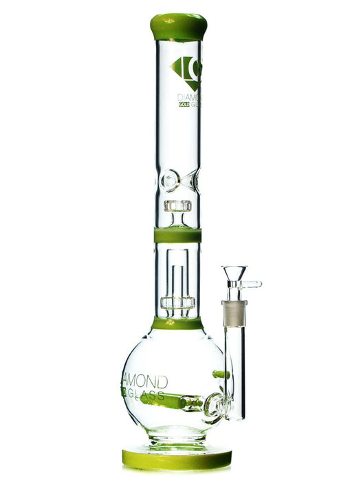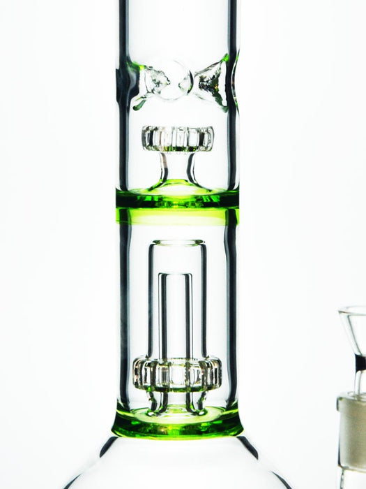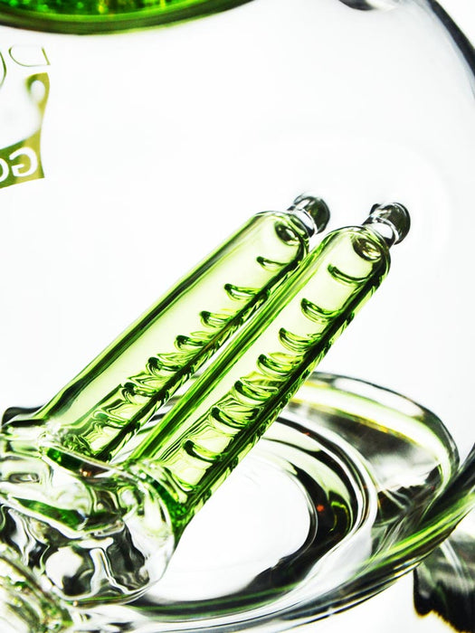 Let's just say we are pretty stoked about this double inline bong with showerhead perc. This is a classic design that is hard to come across these days, but we got it done. This crystal clear glass bong features a dual inline stem that leads up to a showerhead perc for vigorous filtration and a smooth pull that is easy to clear. It's no wonder why the inline perc is forever a classic bong design with many die hard fans.
