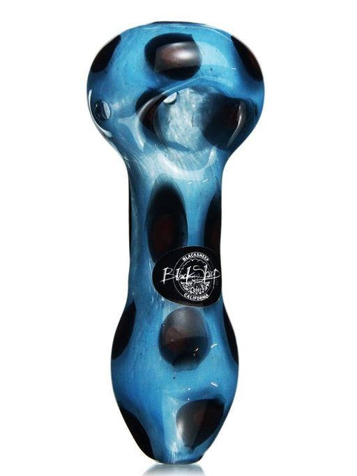 The leopard print glass pipe is made with light blue glass with burgundy and black spots all throughout. Just over 4" in length makes it the perfect daily piece. It has a nice deep bowl and perfectly sized bowl hole and mouth hole. The extra wide chamber is ideal for small or larger draws. A must have for your collection of glass. Quantities are limited so act quickly.