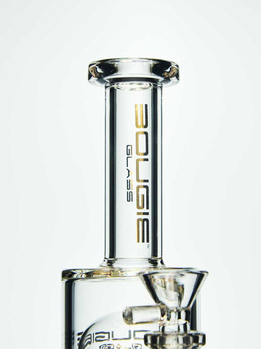 This 10" Bong by Bougie Glass is not just aesthetically pleasing from top to bottom, it also features some insane percolation that is made with thick glass. Starting with the showerhead percolator that is perfectly flared with laser cut slits, this will give a quick filtration without any drag. Above that is the tree perc, this will keep the water from climbing up and also cool the smoke down even more.