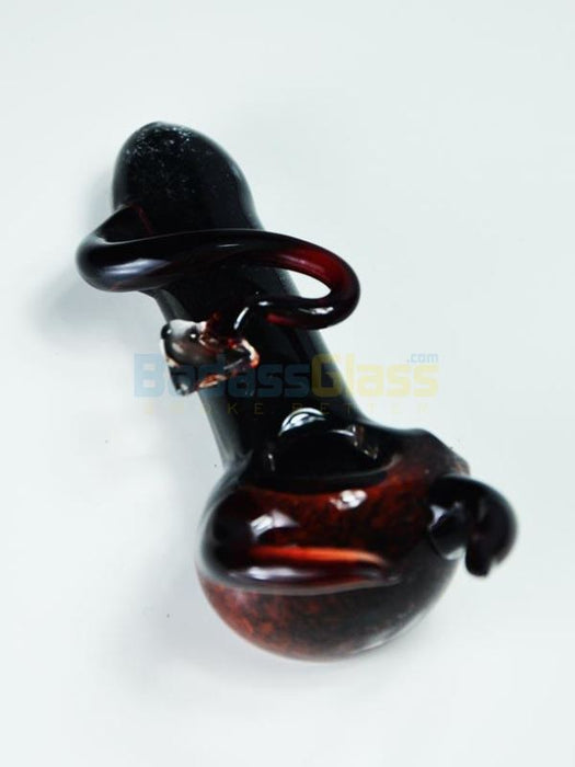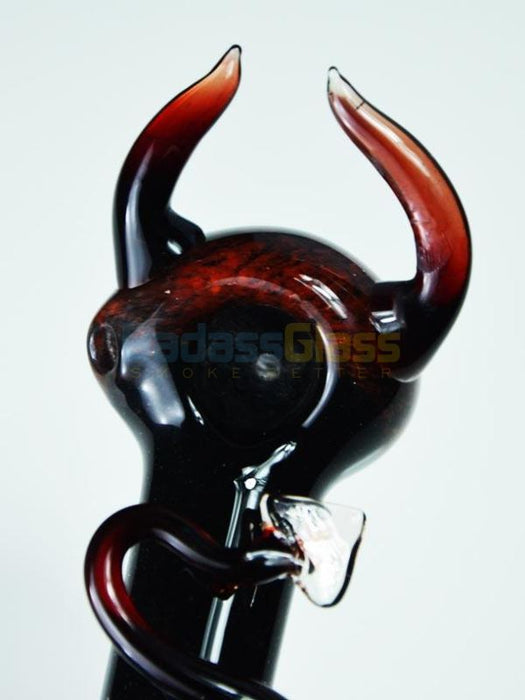 The Prince of Darkness, Satan, and Lucifer are all names given to the demonic ruler of the underworld, more simply known as "The Devil." The Devil's Pipe allows you to sinfully partake in your favorite herb with it's traditional spoon design, and deep bowl. Thoughtfully constructed, this piece has a nice gradient color that goes from a dark black to a blood red, and devil's horns and a tail that make it a glass masterpiece.